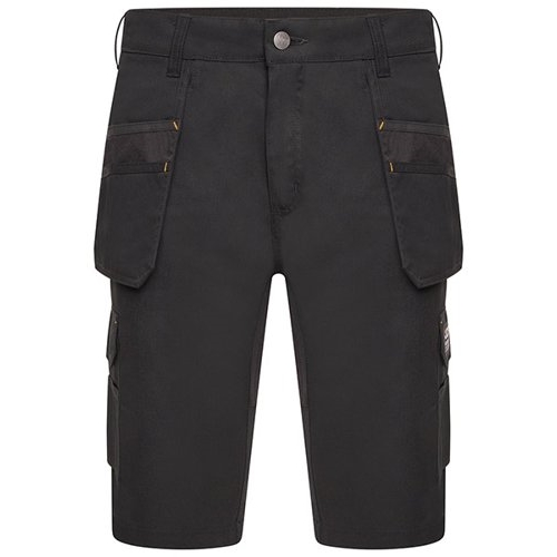 JCB Trade Hybrid Stretch Short. Twill fabric 35% cotton 65% polyester 250gsm. Stretch fabric 92% nylon. 8% spandex 285gsm. YKK zip fastening. Left leg multiple pockets. right leg multiple pockets. Two back pockets. Holster pockets.